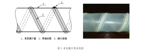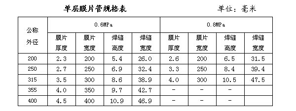 单层膜片管材是由单层超高膜片螺旋缠绕成型,再利用性能优良的特种聚乙烯粘合材料(性能表见表2)将膜片螺旋接缝热熔焊接而成。弧形突起的粘合材料螺旋焊缝(焊缝高度和宽度见表3),不但具有足够的连接强度和承压能力,还能起到增强管道环刚度的作用,见图2。